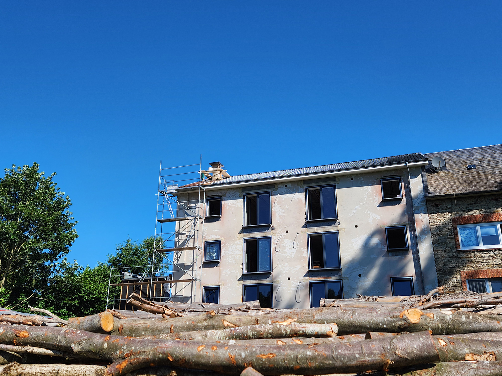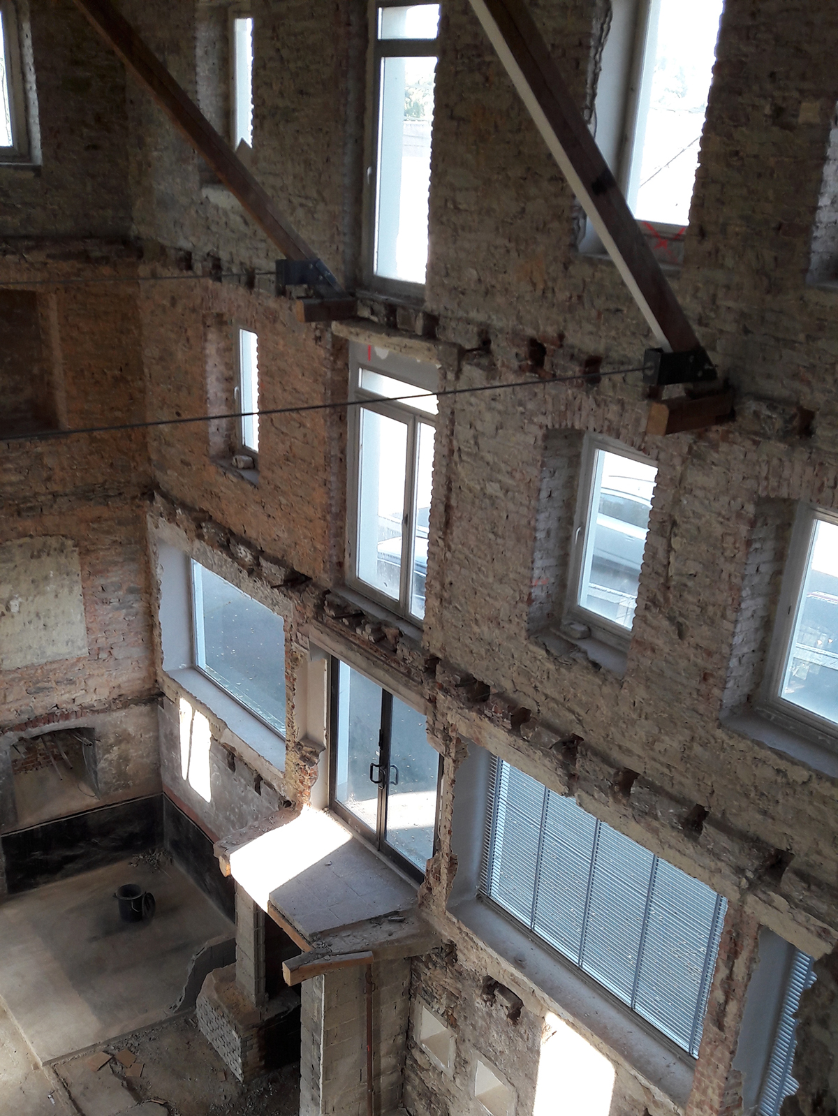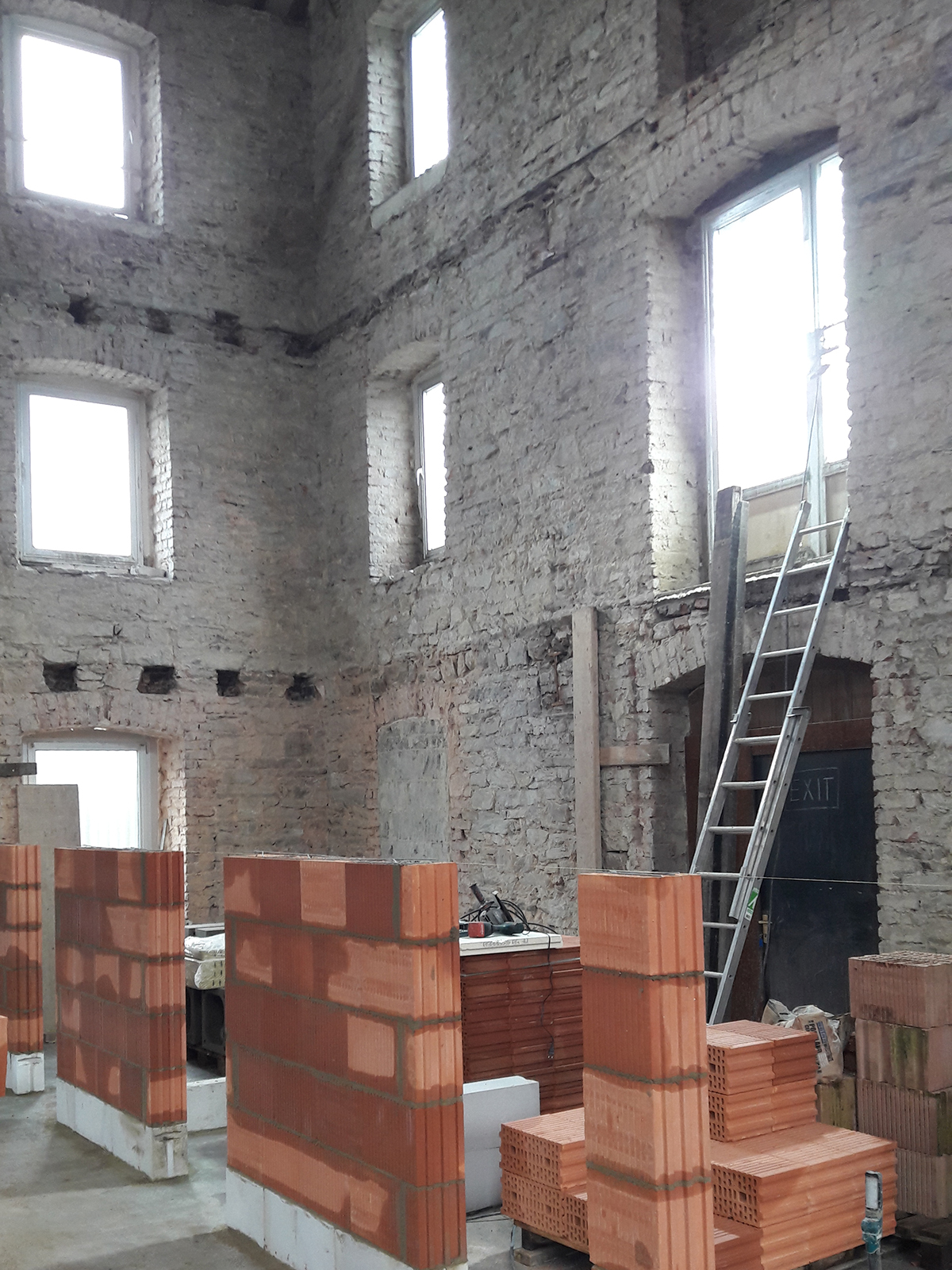 Bei dieser Kernsanierung haben wir das Gebäude entkernt, neue Fensteröffnungen geschaffen, das Mauerwerk im Inneren komplett erneuert und neue Decken eingezogen.