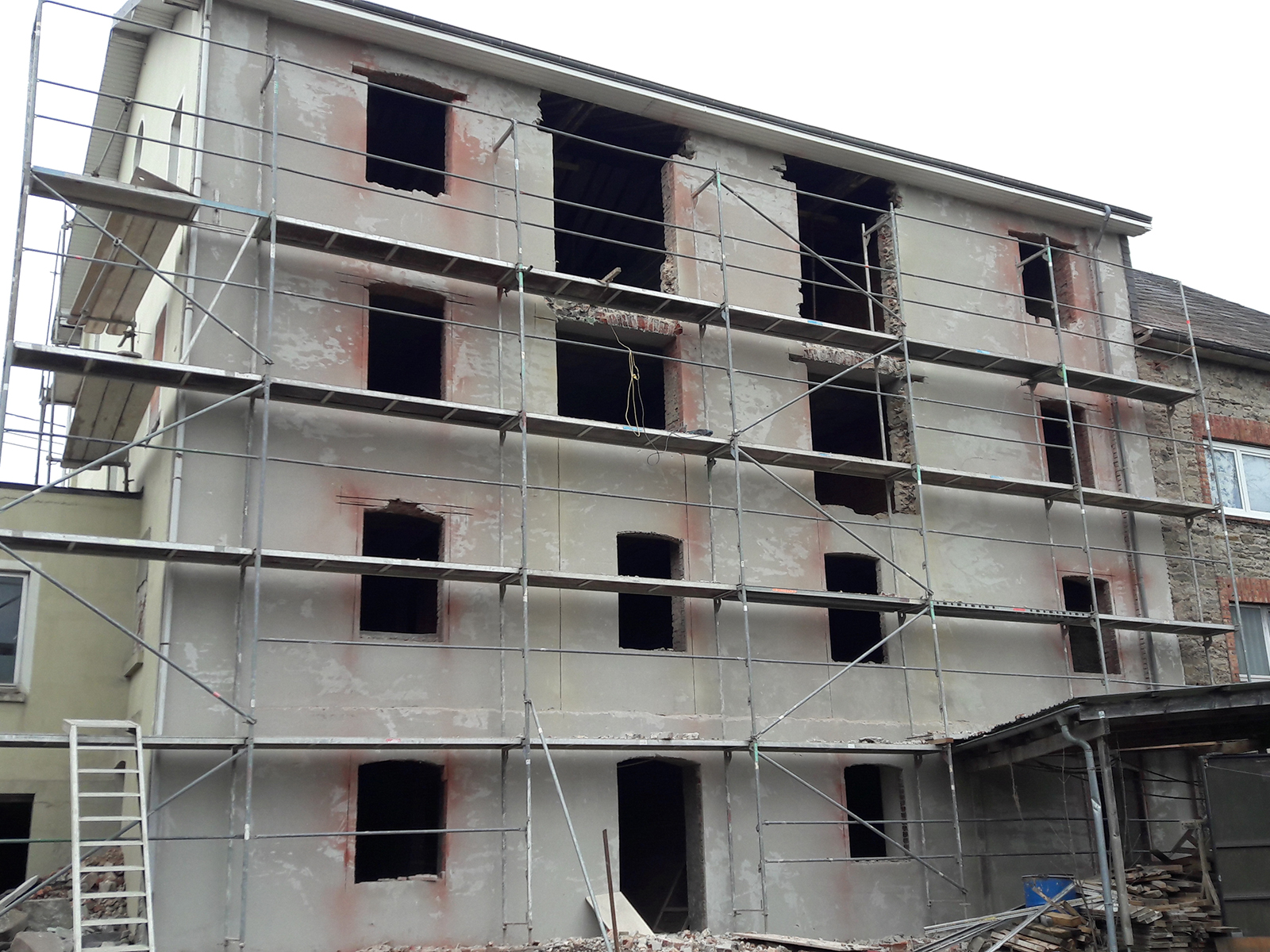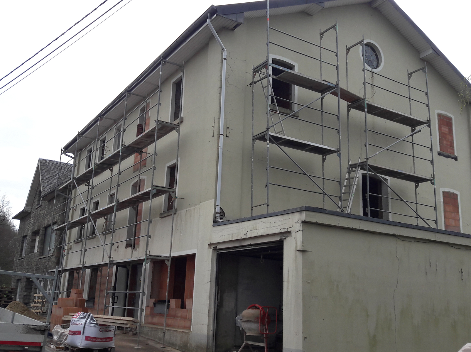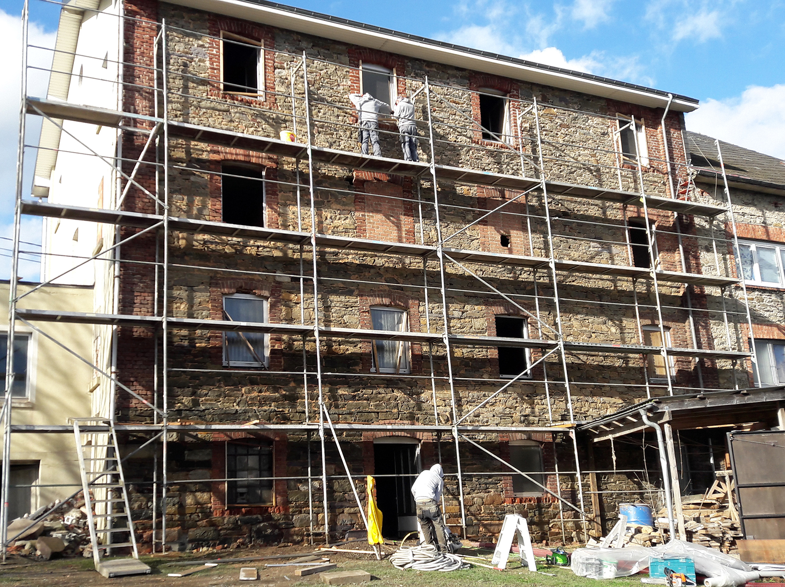 Bei dieser Kernsanierung haben wir das Gebäude entkernt, neue Fensteröffnungen geschaffen, das Mauerwerk im Inneren komplett erneuert und neue Decken eingezogen.